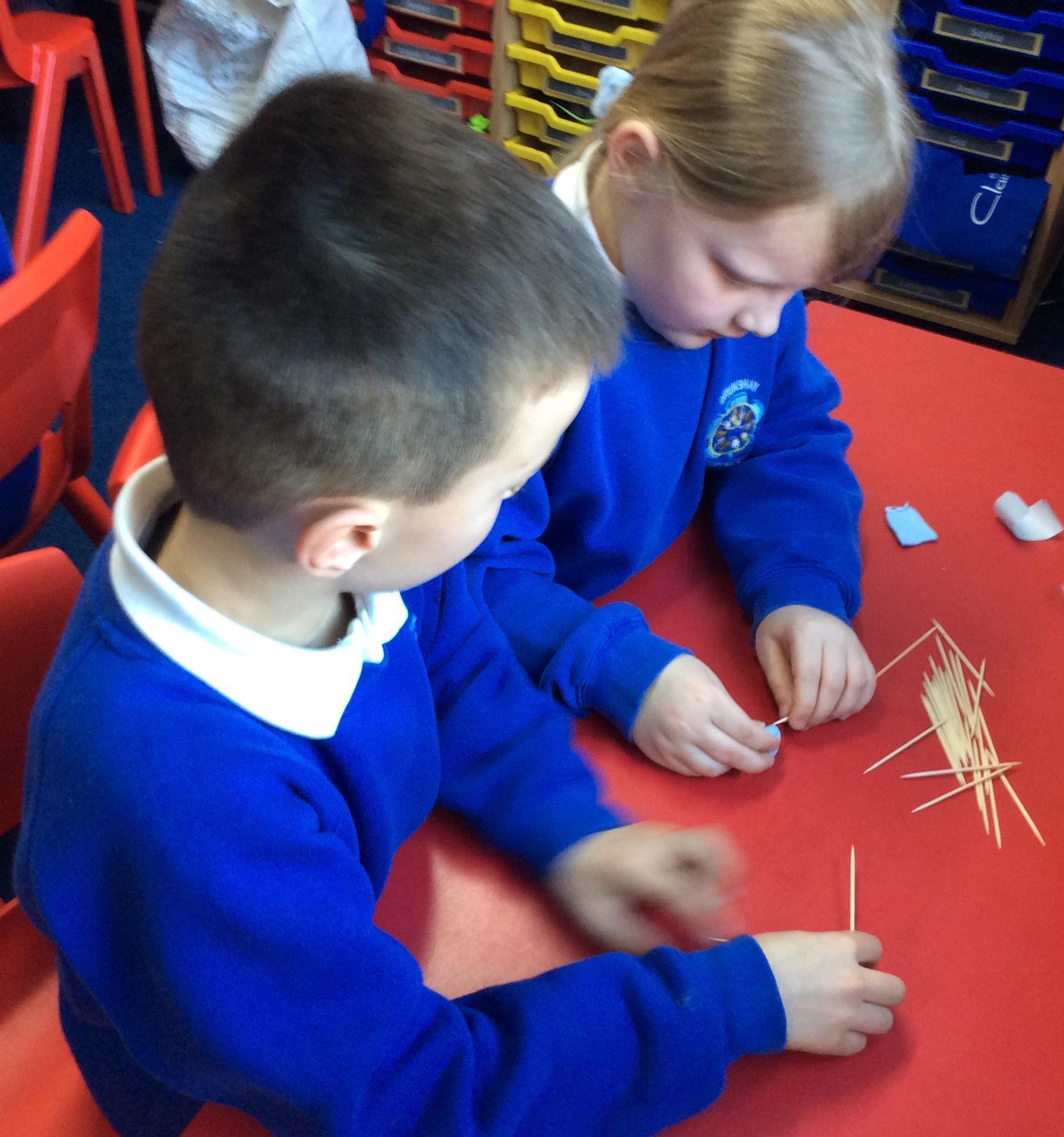 To help us learn about faces, edges and vertices we have been making 3D shapes using cocktail sticks and Blue Tack.