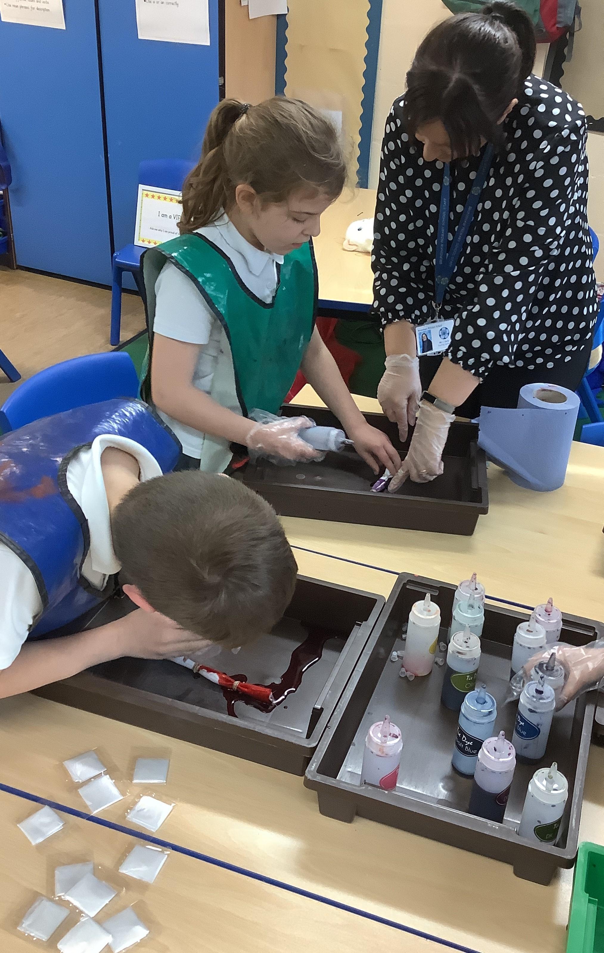 We have been learning about tie dyeing and how we can make fabrics resist dye. We had great fun and the results were amazing!