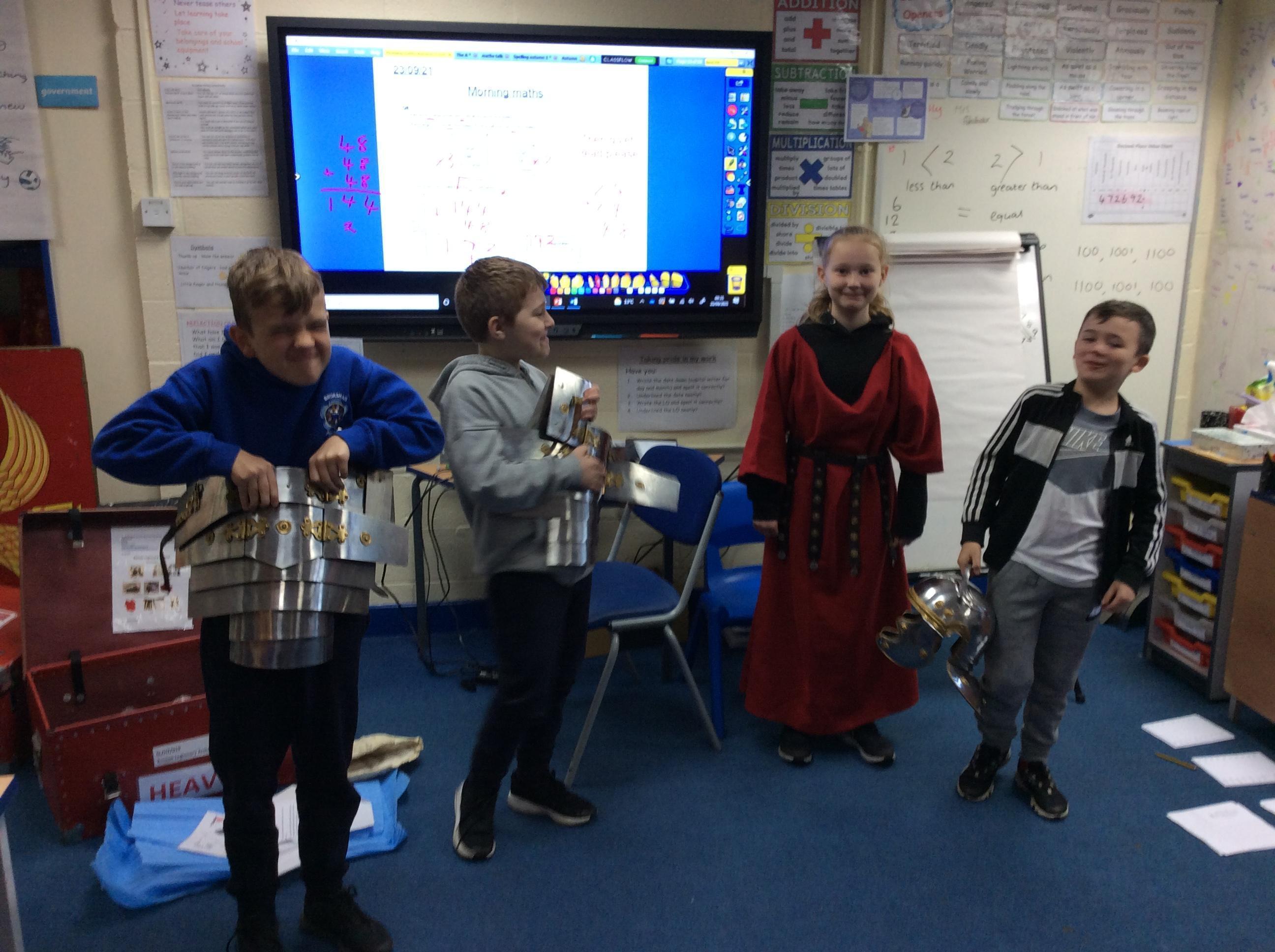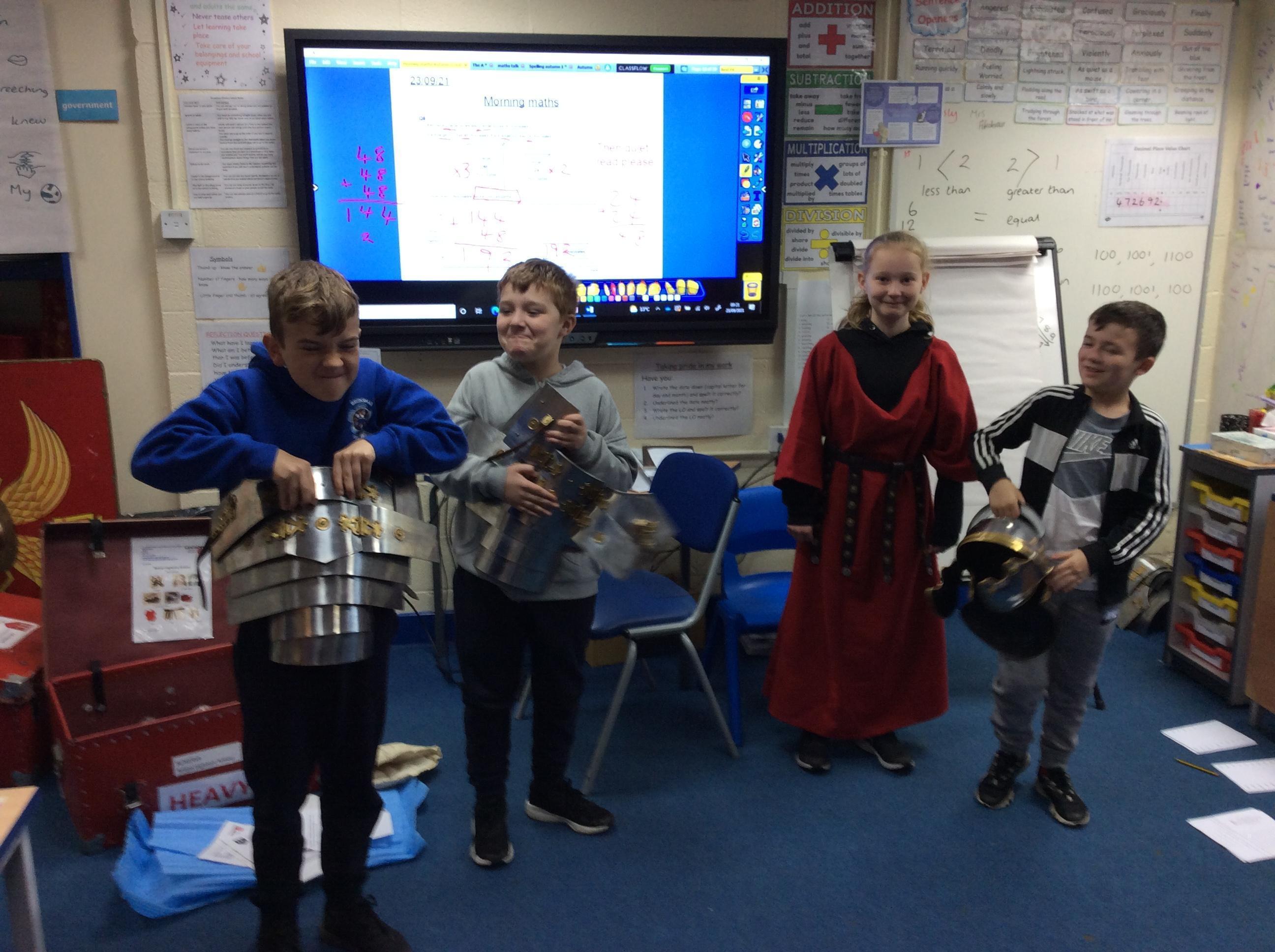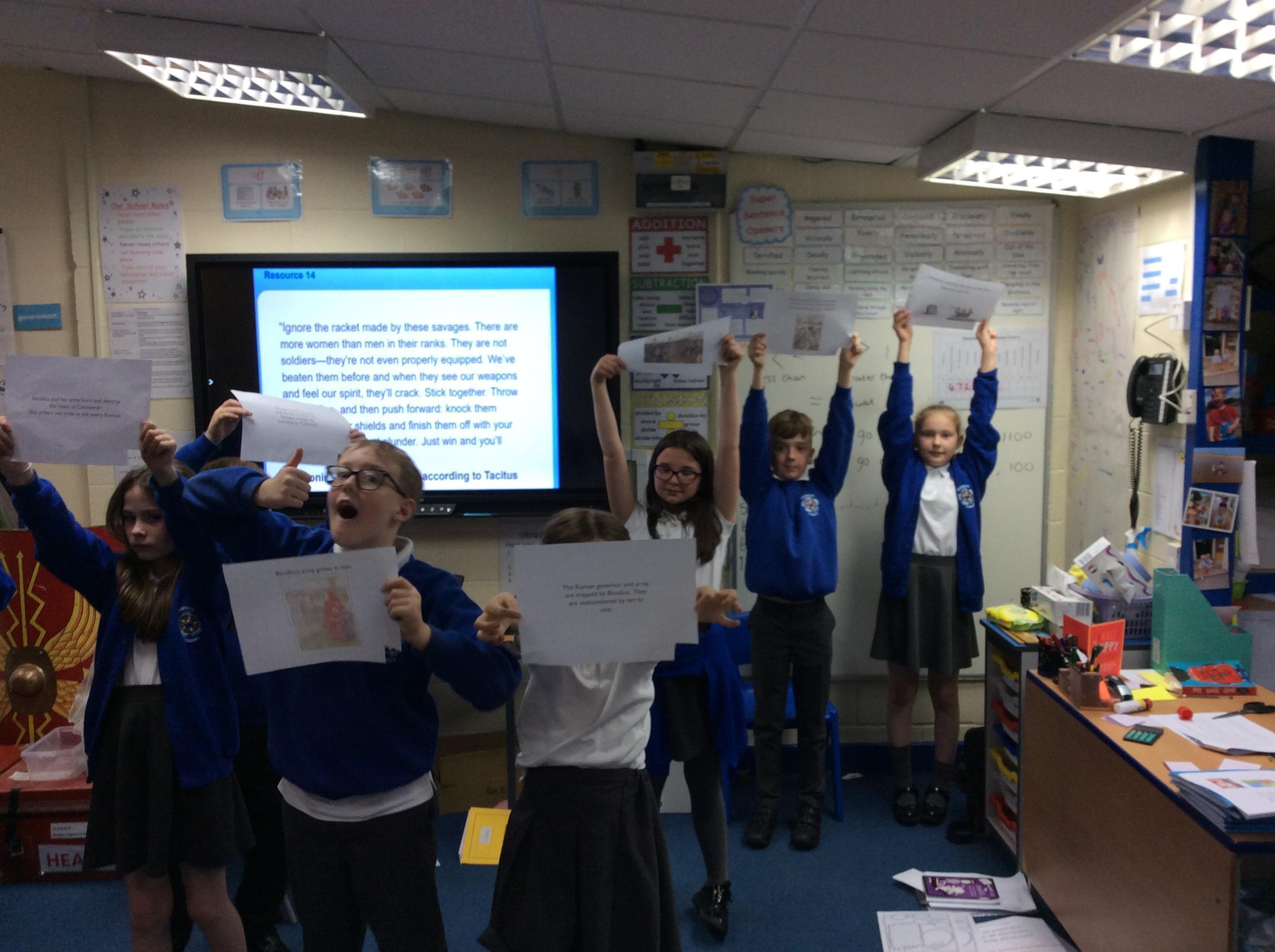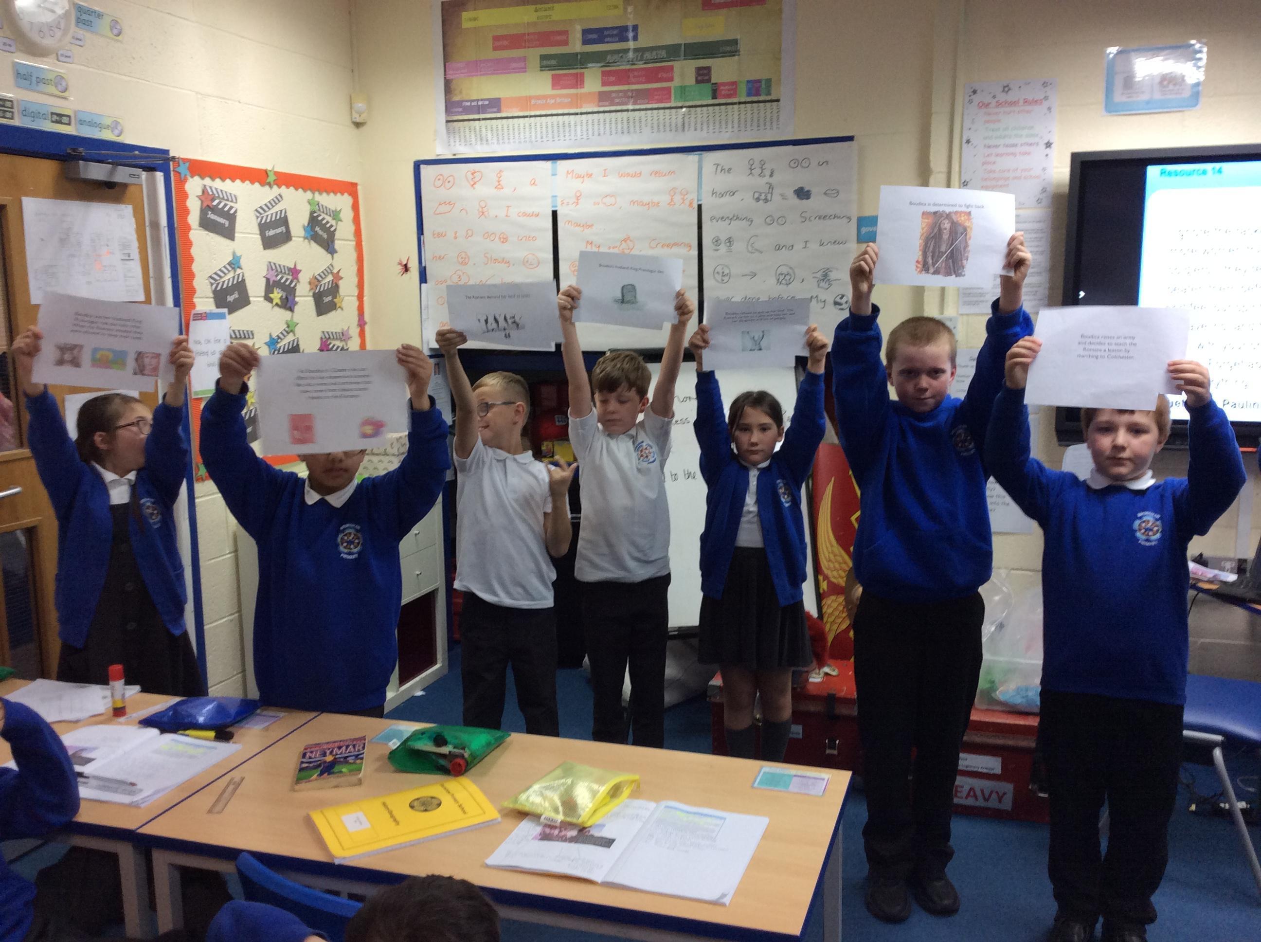 We have had a fabulous week in History – handling all the Roman artefacts from the local museum! We couldn’t believe how heavy they were and it proved how fierce and strong their army was! We also looked at how the British revolted and looked at one of their leaders – Boudicca. We studied her life and made a chronological human time line of her events!
