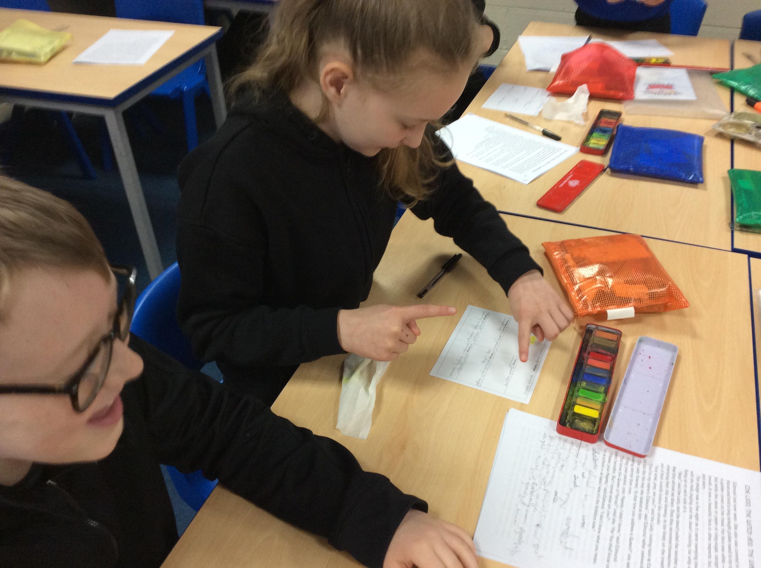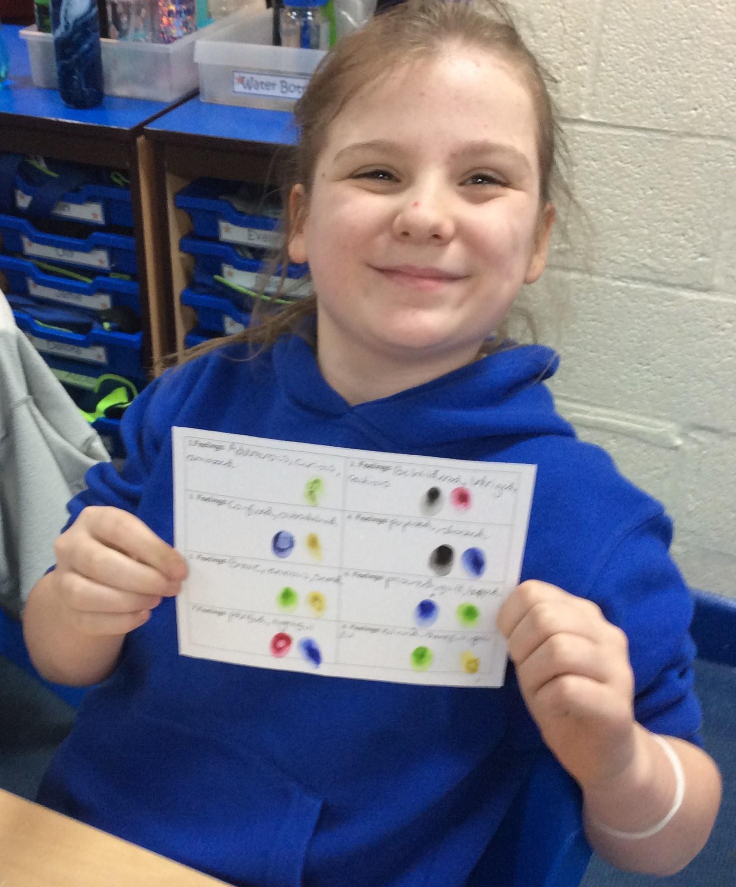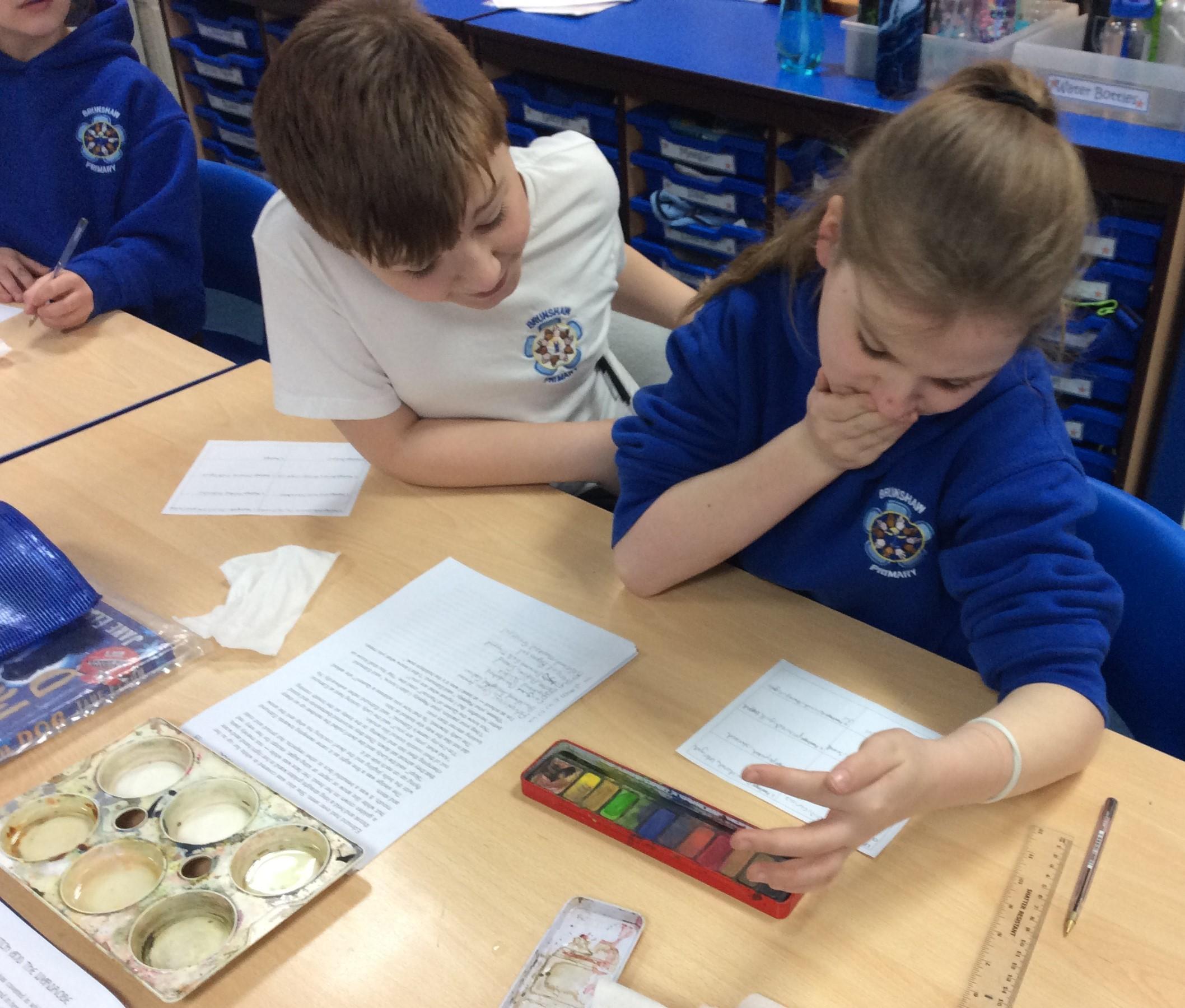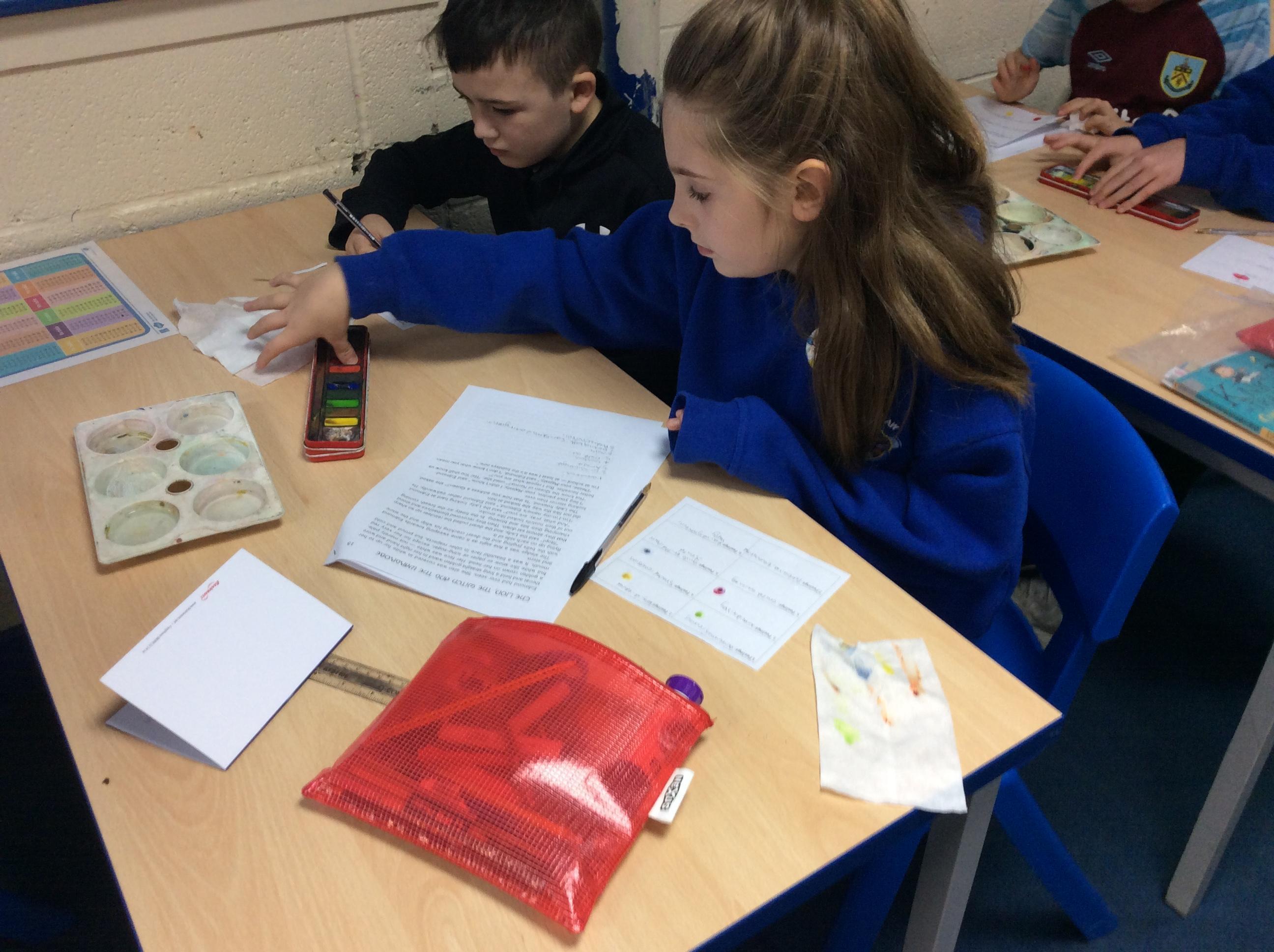We read the first two chapters and looked at the character of Lucy. We thought about her thoughts and feelings throughout the chapters and then looked at 'what colour she may be feeling.' We used water colours to express this!