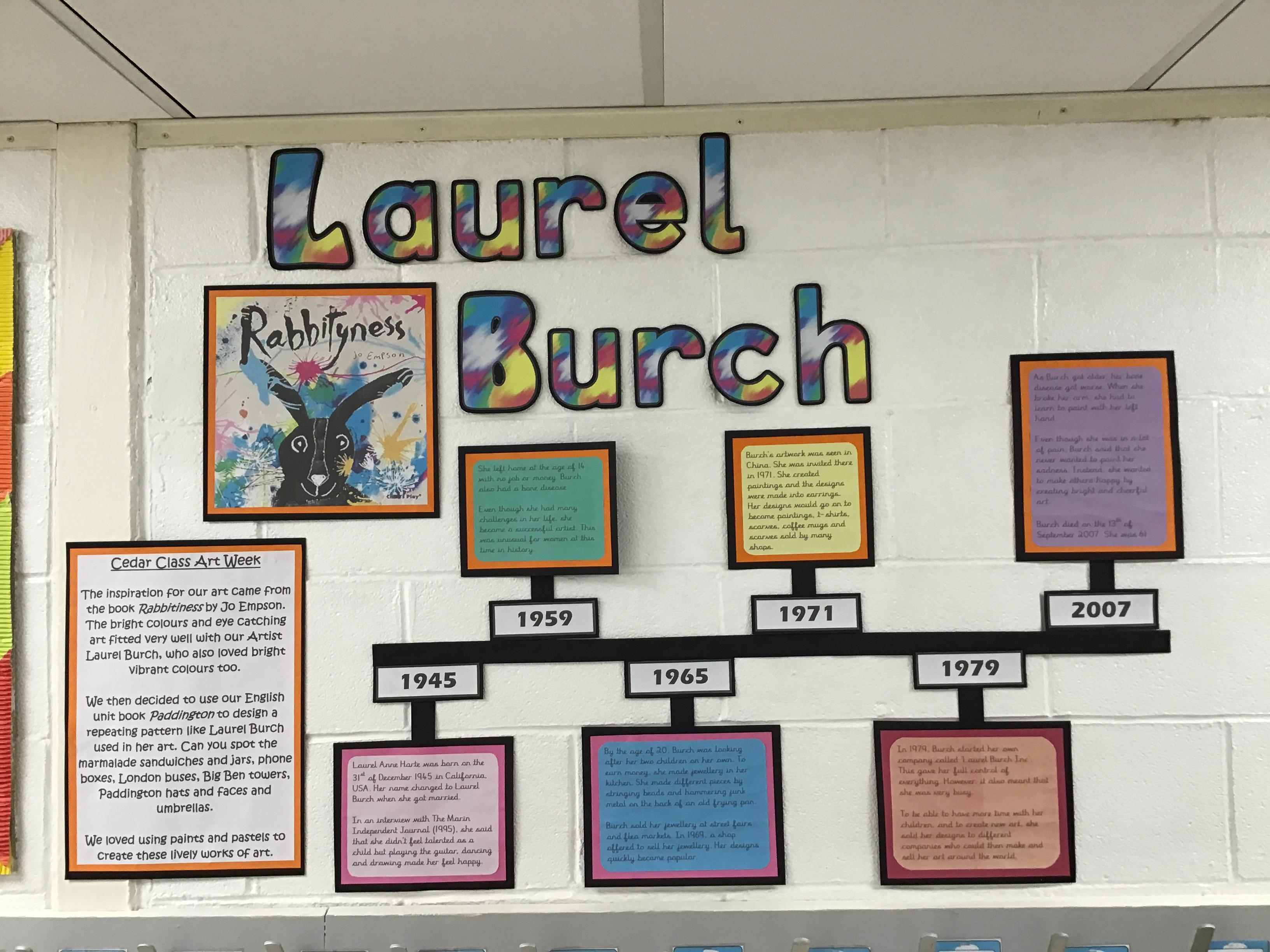 For art week Cedar class studied the artist, Laurel Birch. We were inspired by her bright colourful pieces of art and using our focus book, Rabbitiness, produced some wonderfully vivid art our own. We used bold watercolours and pastels to create the art and then black pens to emphasise the lines over the top. The drawings we chose to use were from our class book Paddington. We drew his hat, umbrella, jars of marmalade, London buses and phone boxes and Big Ben in a repeating pattern to mimic the repeated patterns Laurel Birch used in her art. We hope you enjoy these masterpieces as we are very proud of how our art turned out.