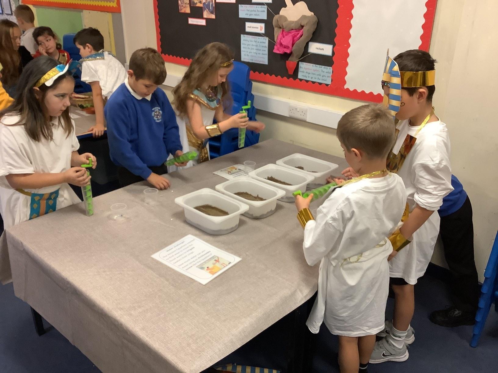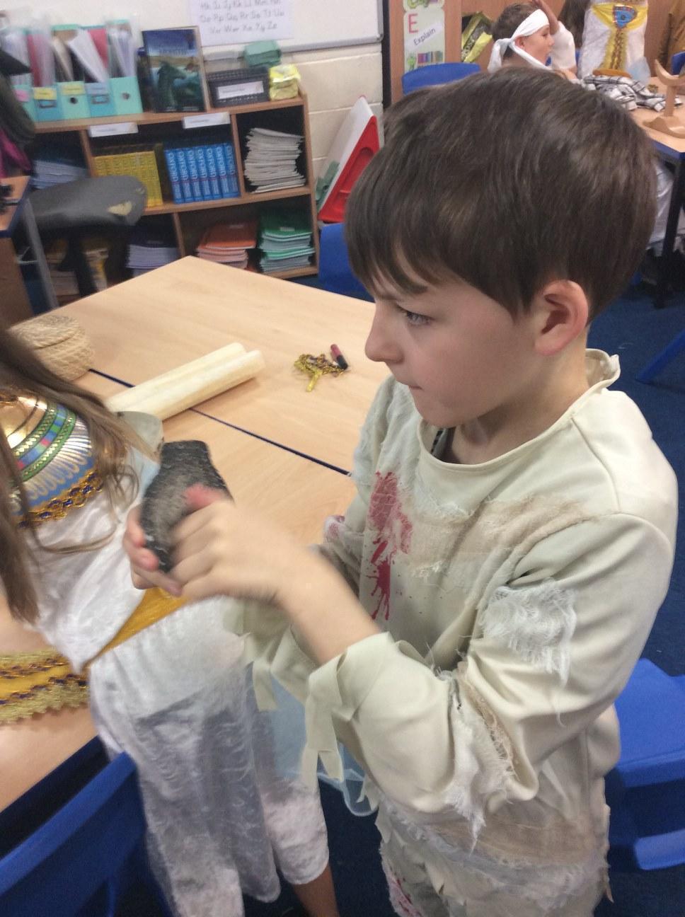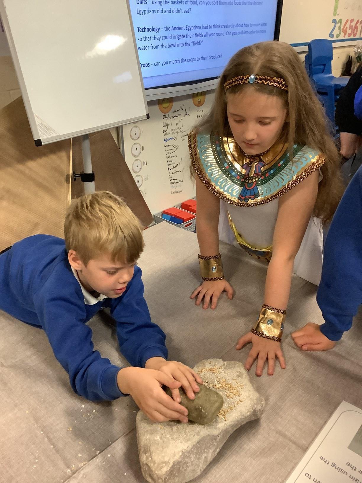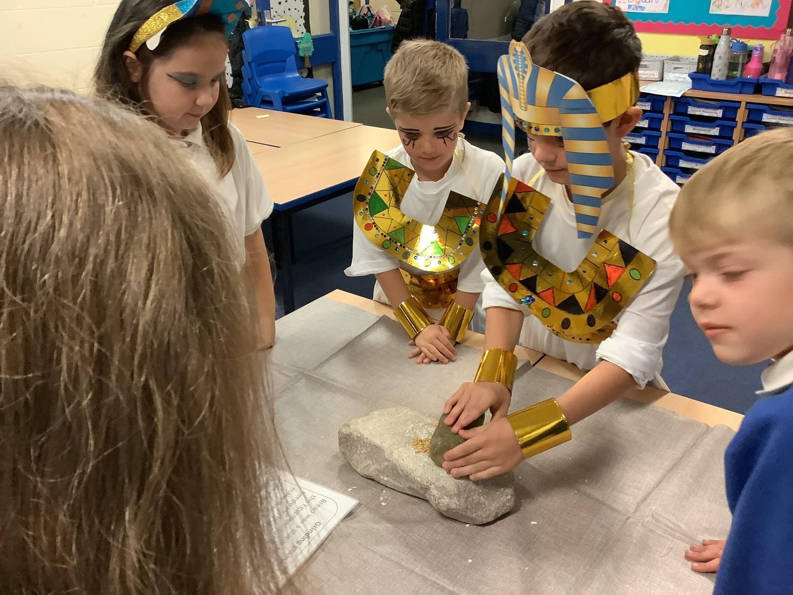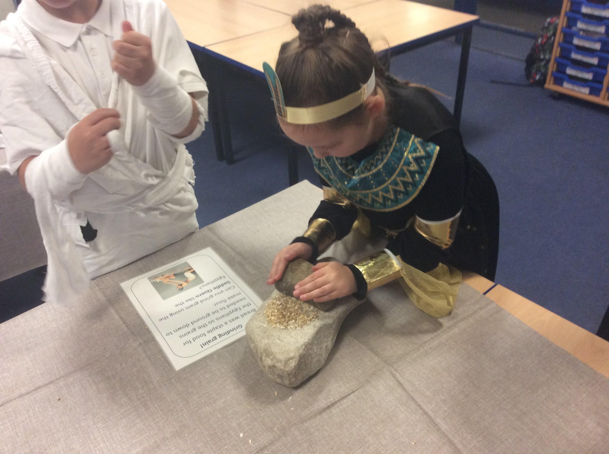 Year four had an amazing Ancient Egyptian theme day on Wednesday! We looked at the different foods that they ate, and we even made our own flour. Then, we looked at lots of different artifacts that told us a lot of information about the Ancient Egyptians. Finally, we had a go at trading lots of different goods with other countries.