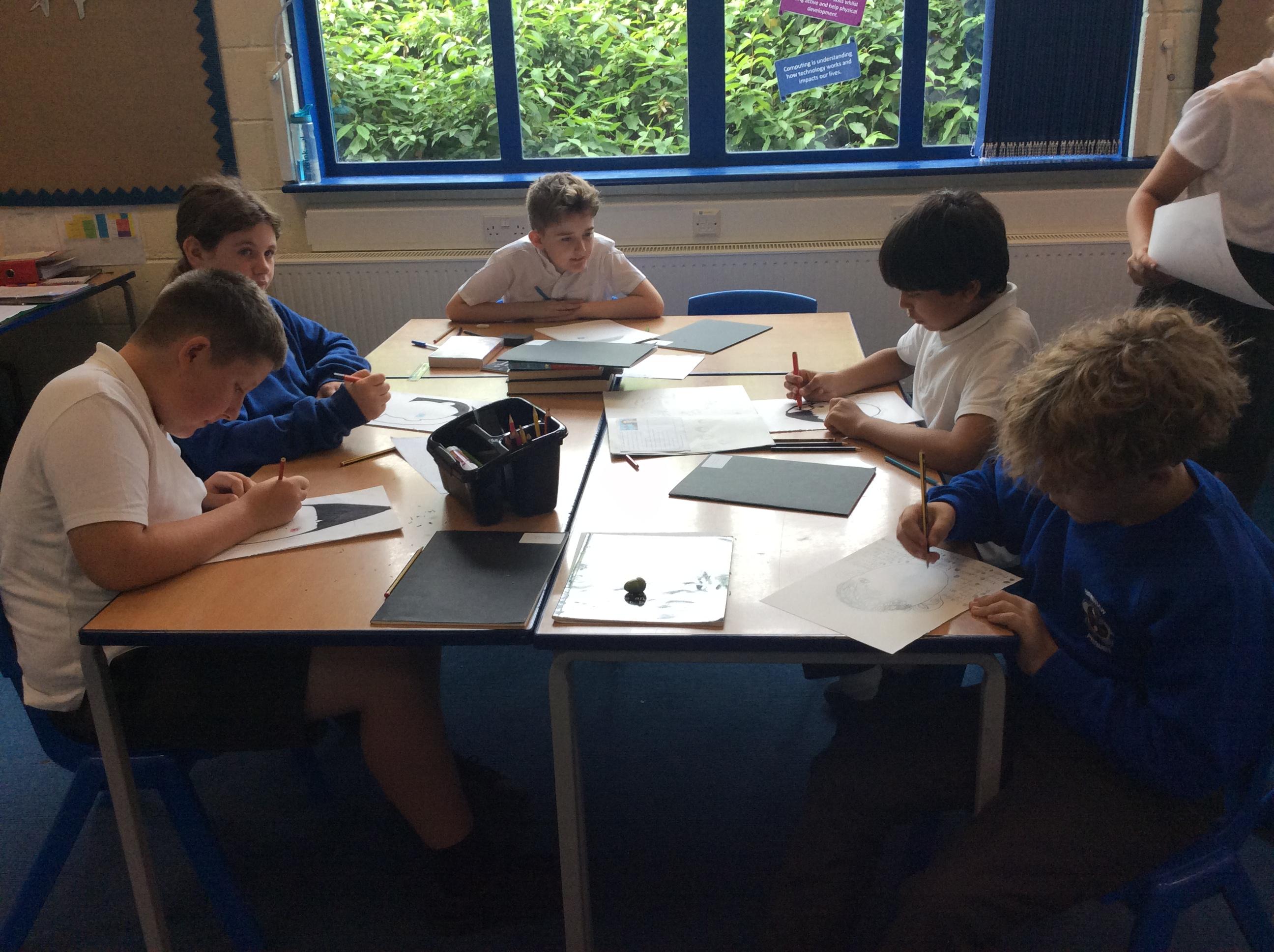 Year 6 creating art work in the style of R.J Palacio based on the book ‘We’re all wonders’.