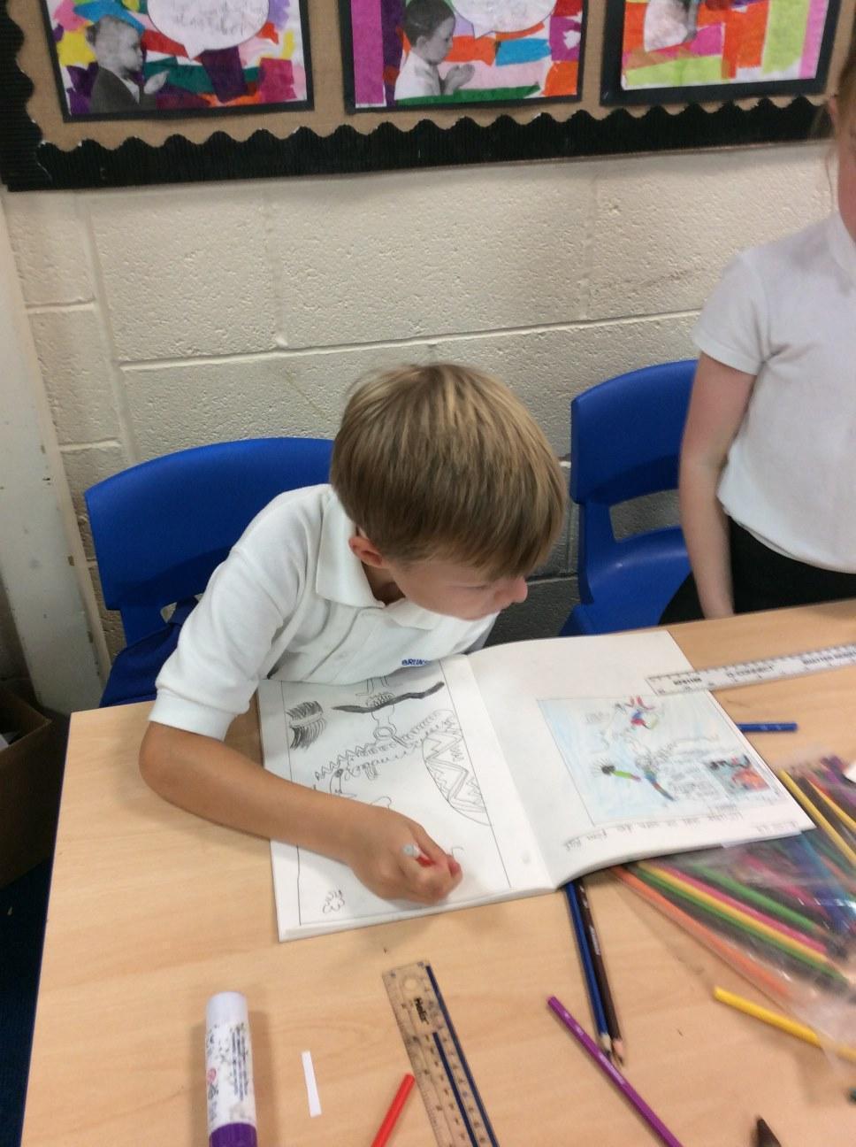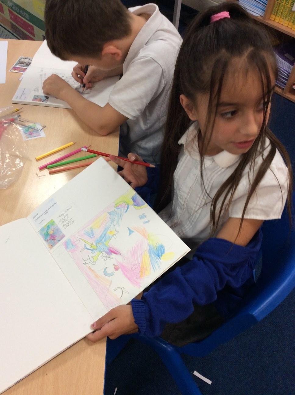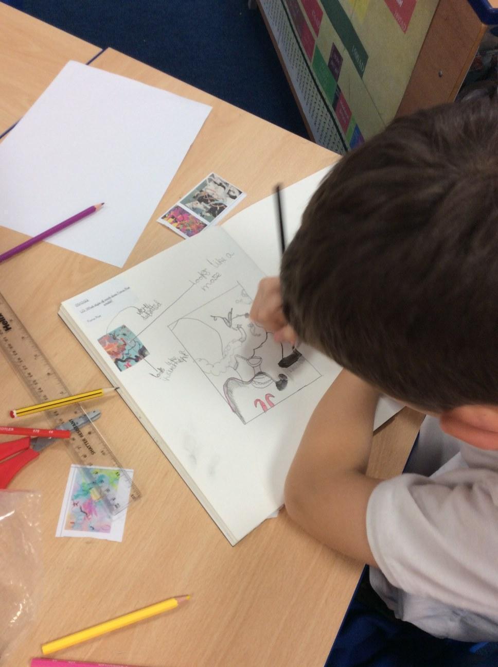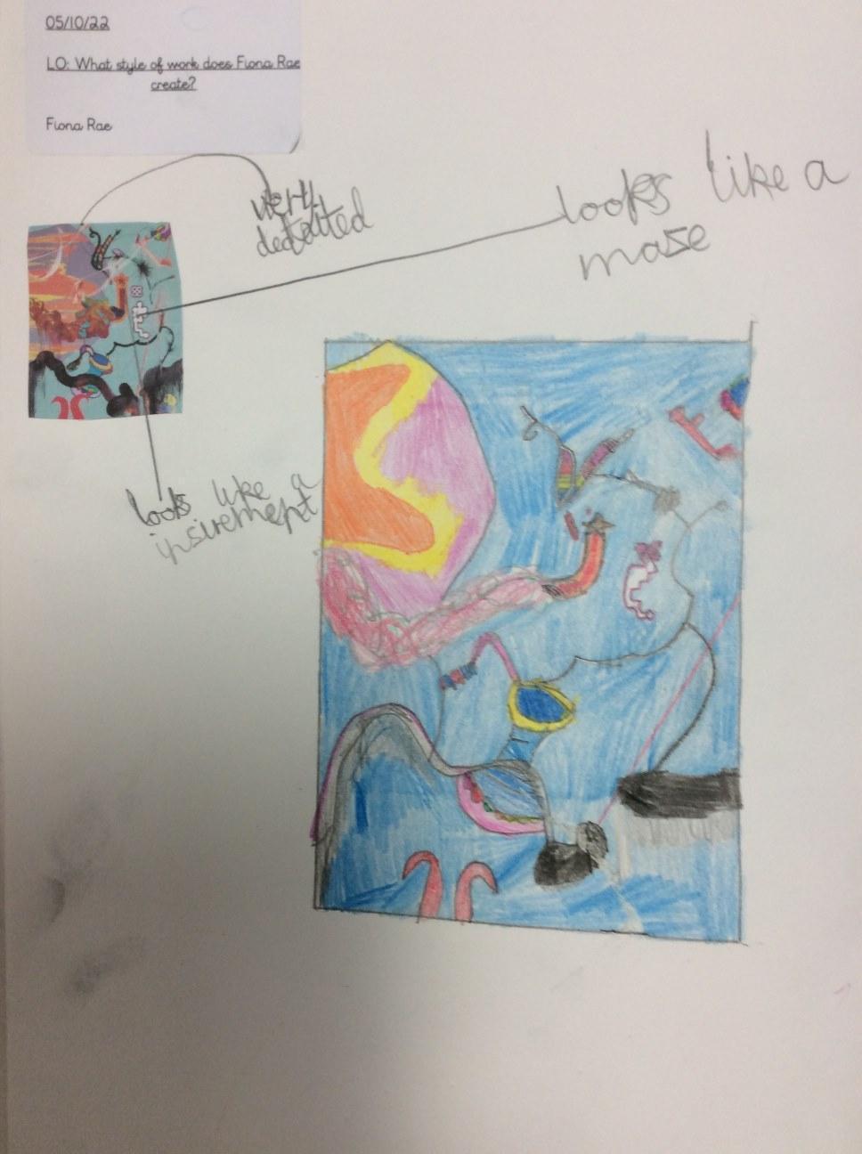 Maple class have been learning about Fiona Rae this week in Art. We learnt how she loves to have a messy art space to create her pieces! She also has a toy dinosaur as her mascot. She loves people to think and imagine whatever they wish to, when looking at her artwork! Take a look at us trying to recreate some.