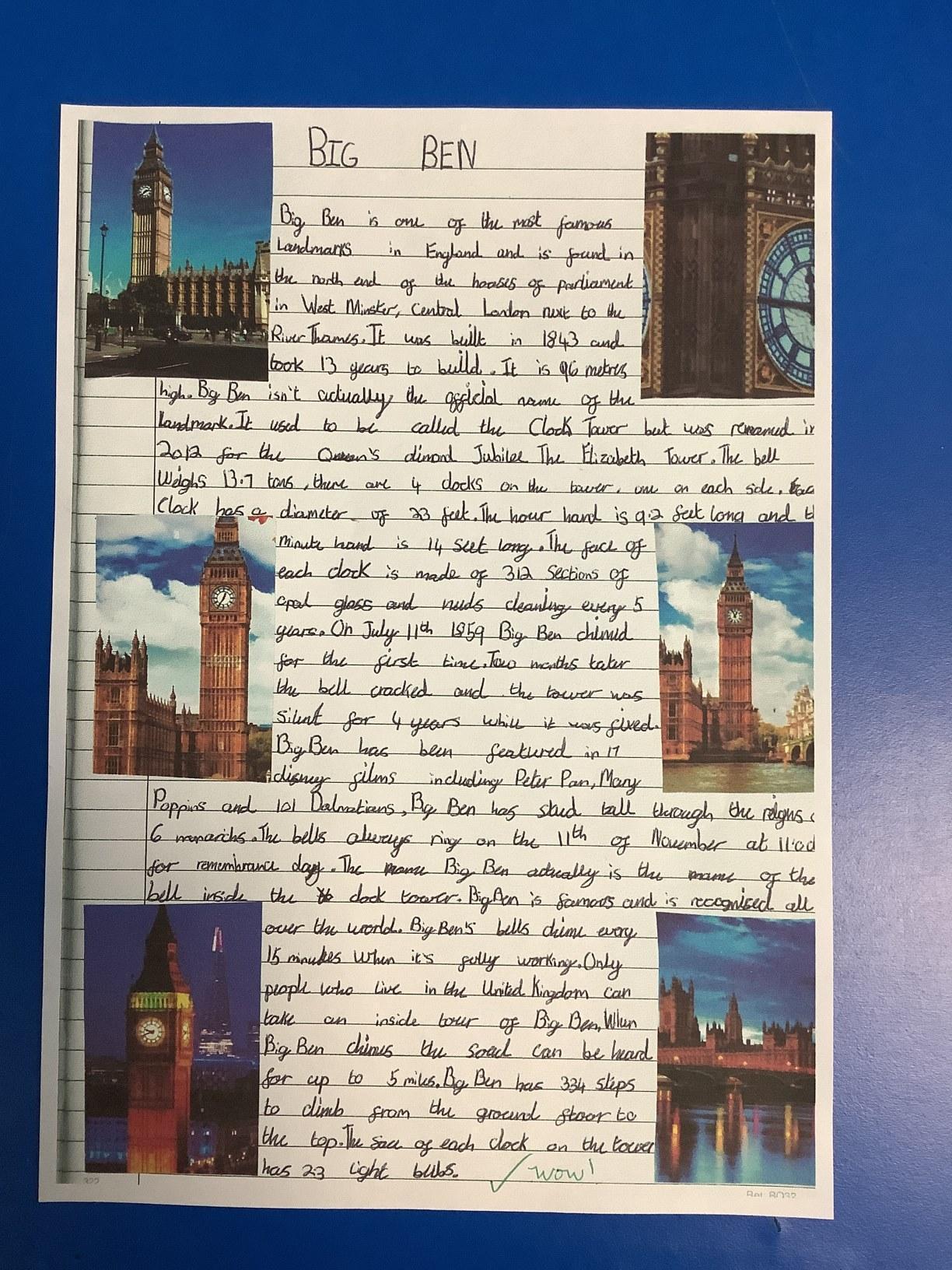 As part of our learning about the United Kingdom, for their homework the children were tasked with researching a famous landmark of the UK and were asked to create a piece of work on their chosen landmark. Here are some of the amazing pieces of work that they produced.
