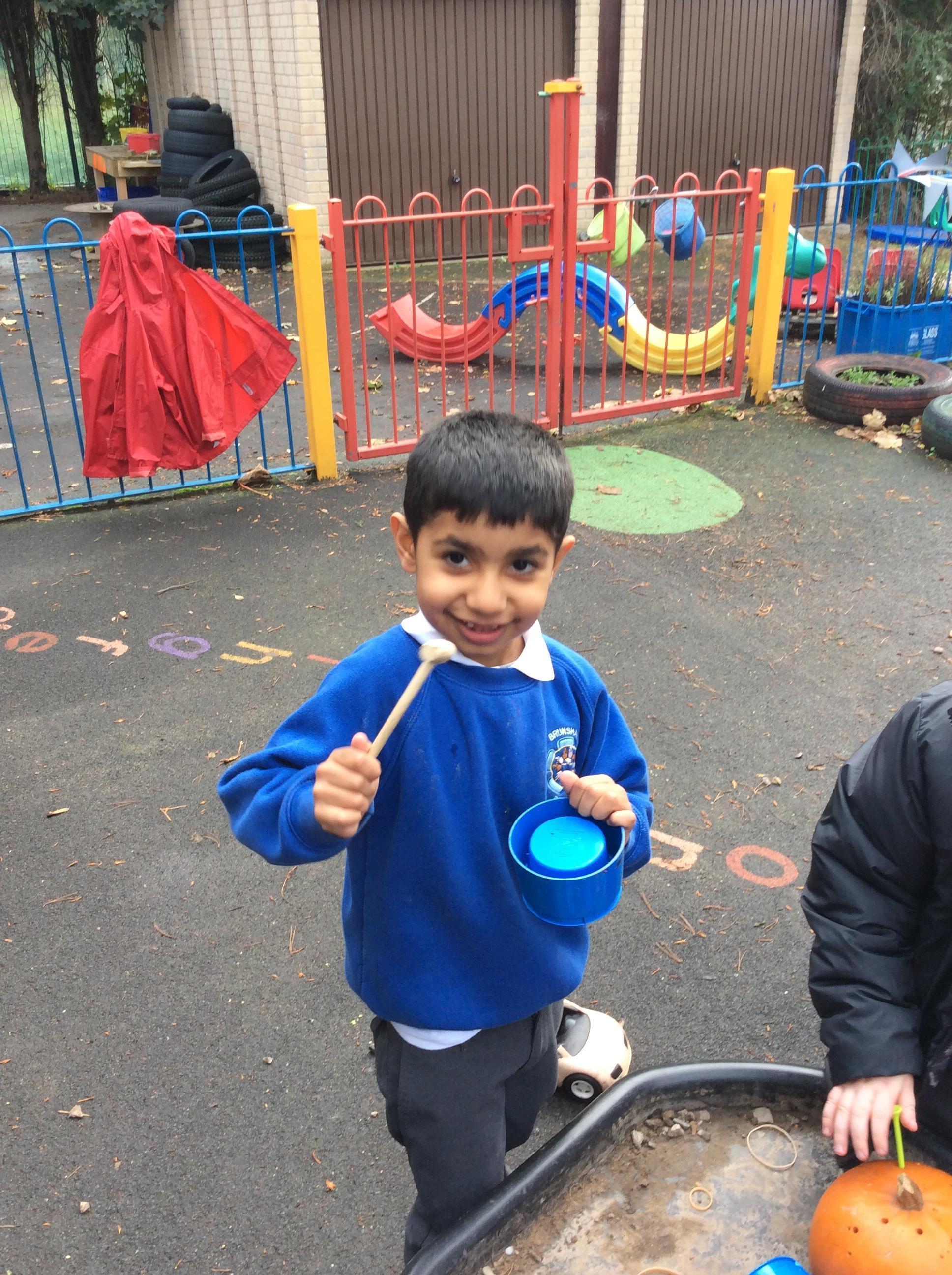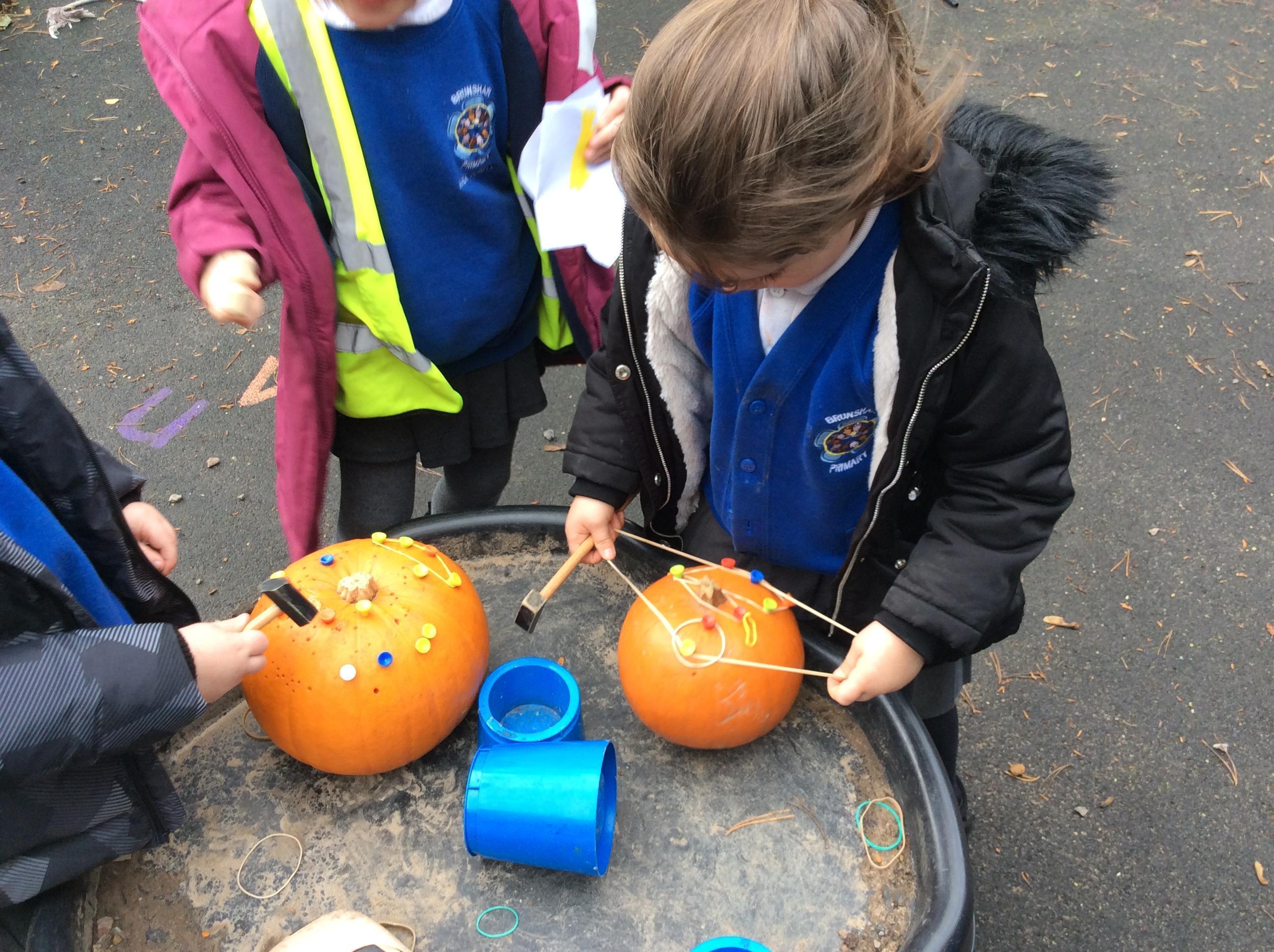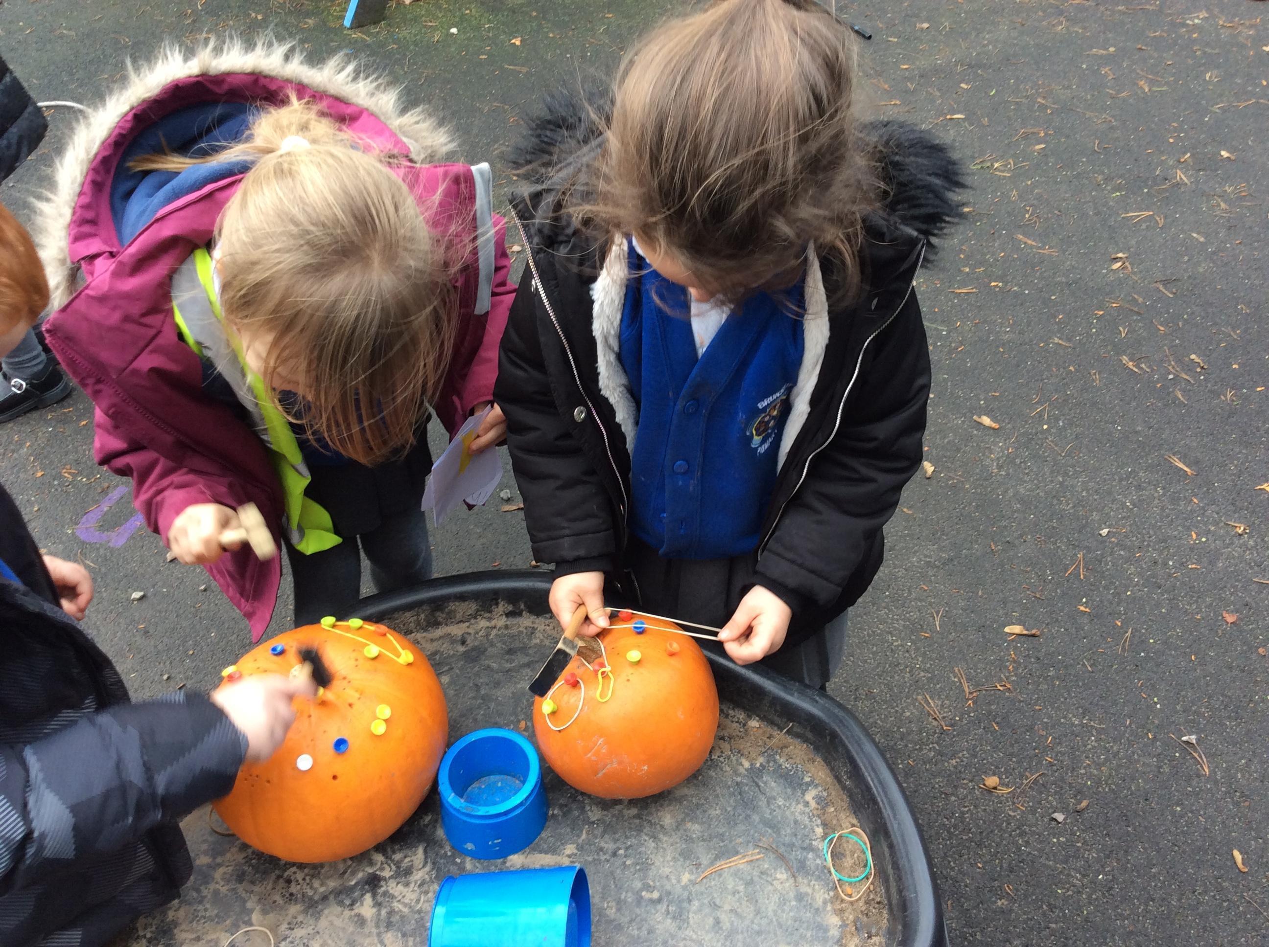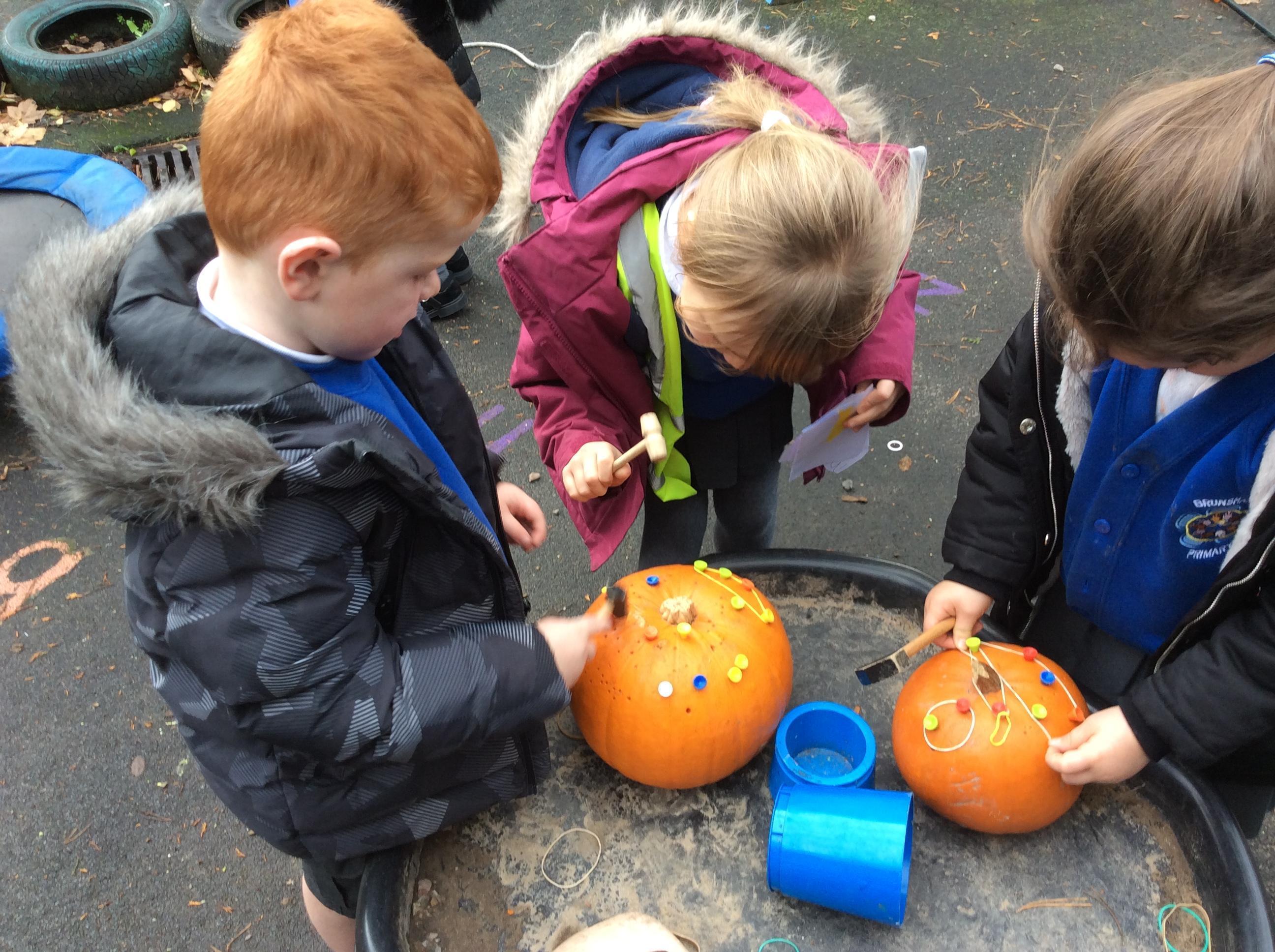 In reception and year 1 this week we have started exploring our hammering skills by hammering golf tees into pumpkins.