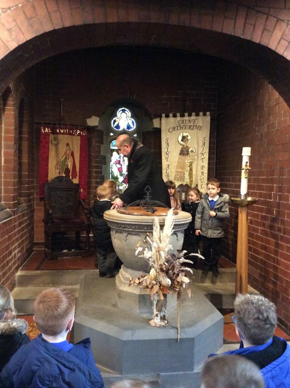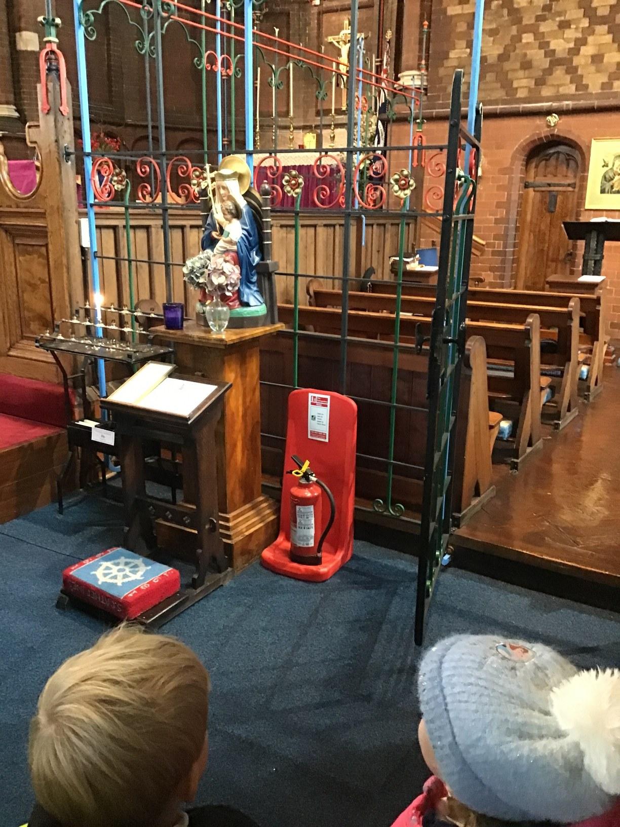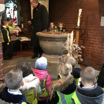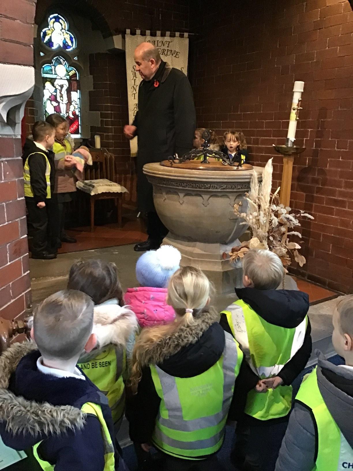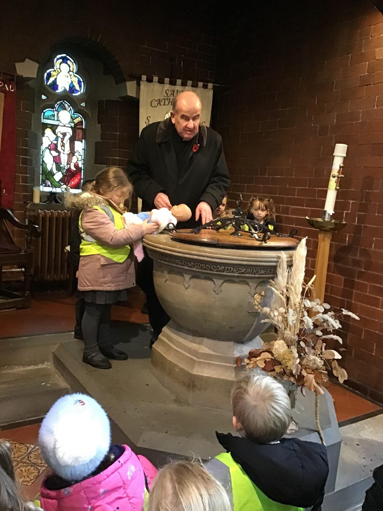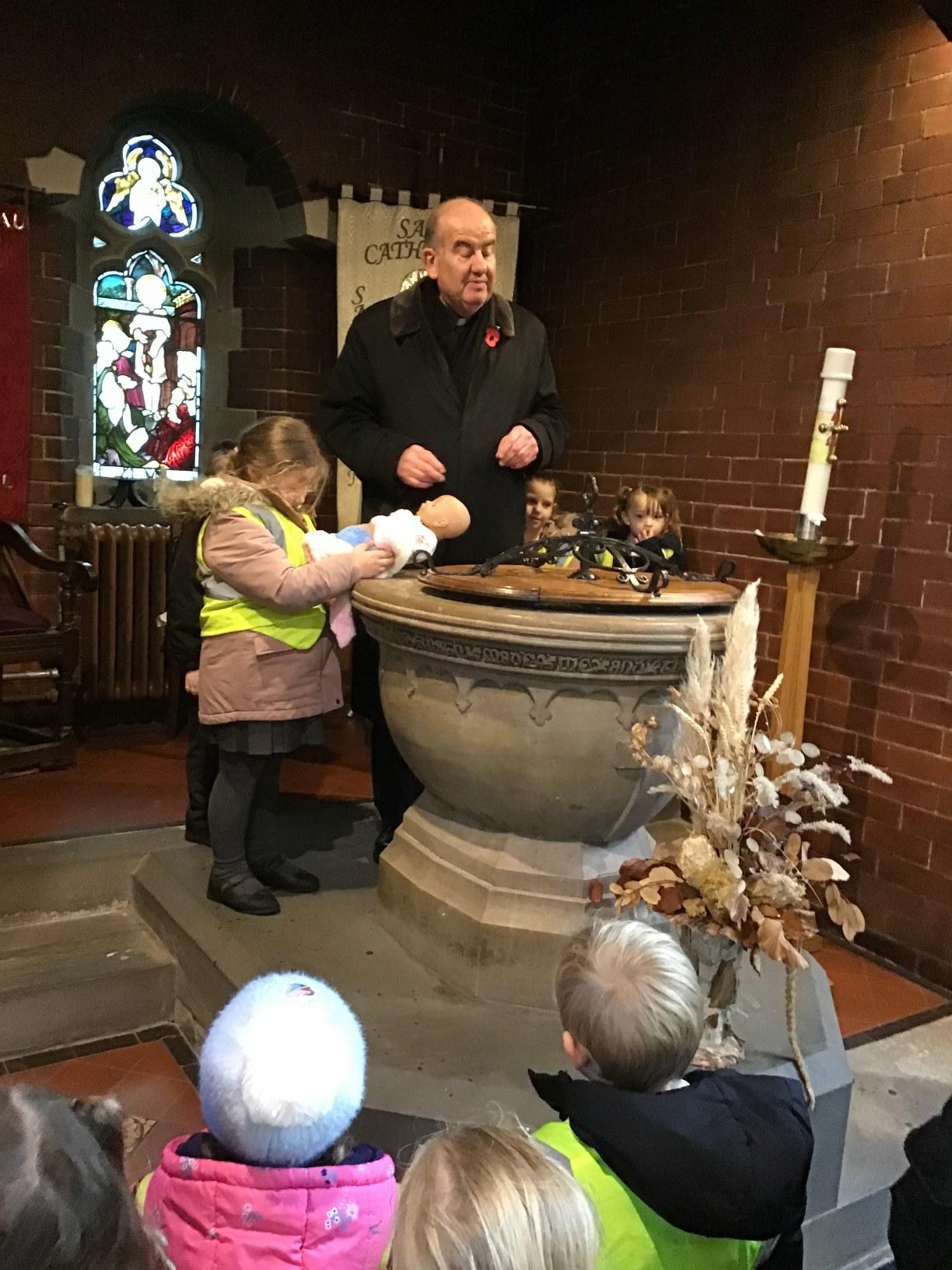 Year 1 visited St Catherine's church on Tuesday as part of their RE learning. Father Roger showed us around the church and staged a baptism using a dolly. He used holy water and the sign of the cross. After the Baptism we lit a candle. The children loved taking turns to push the pram with baby Annabelle in. The children enjoyed being in church and were very well behaved.