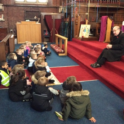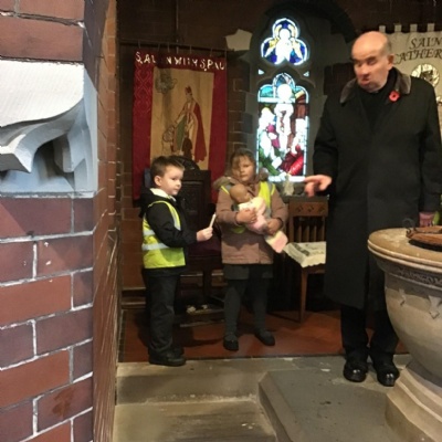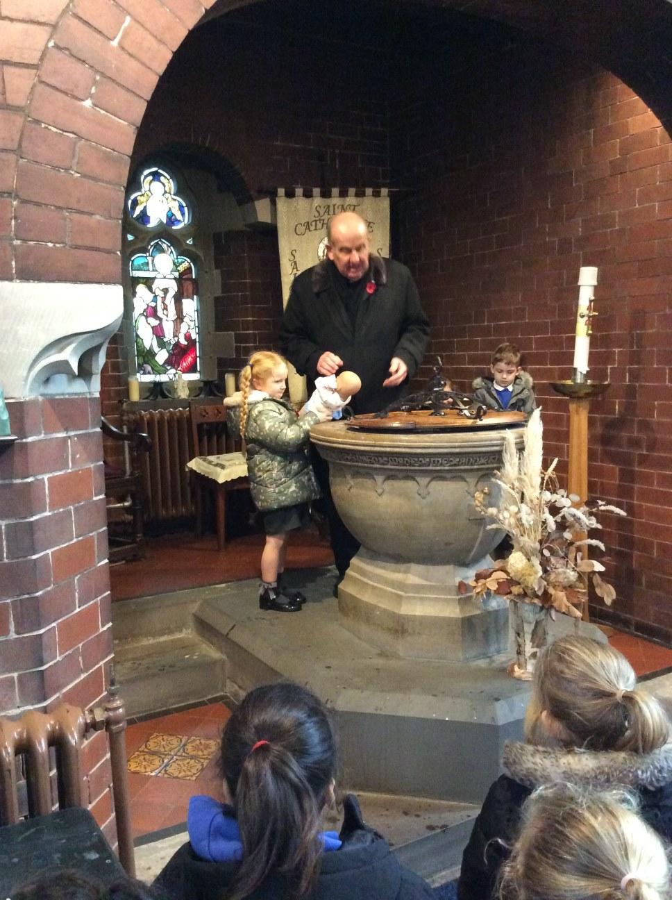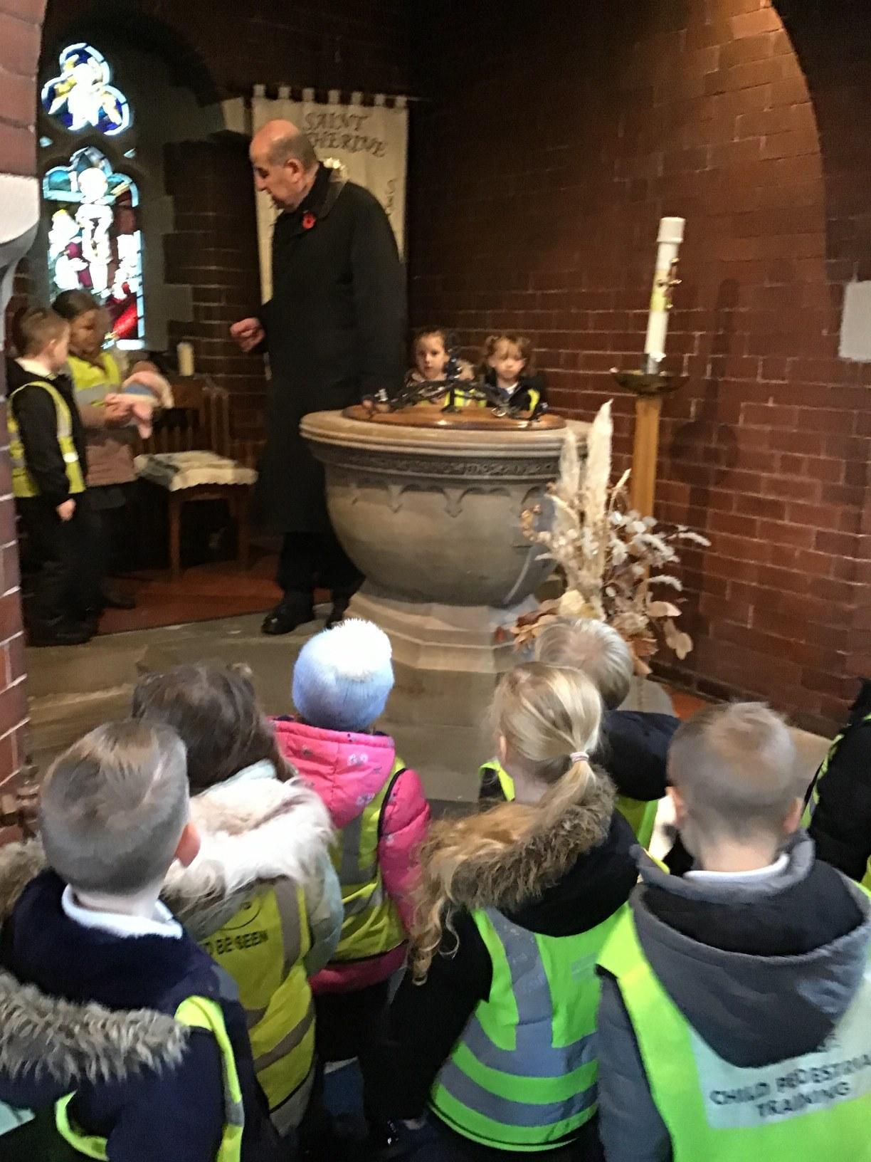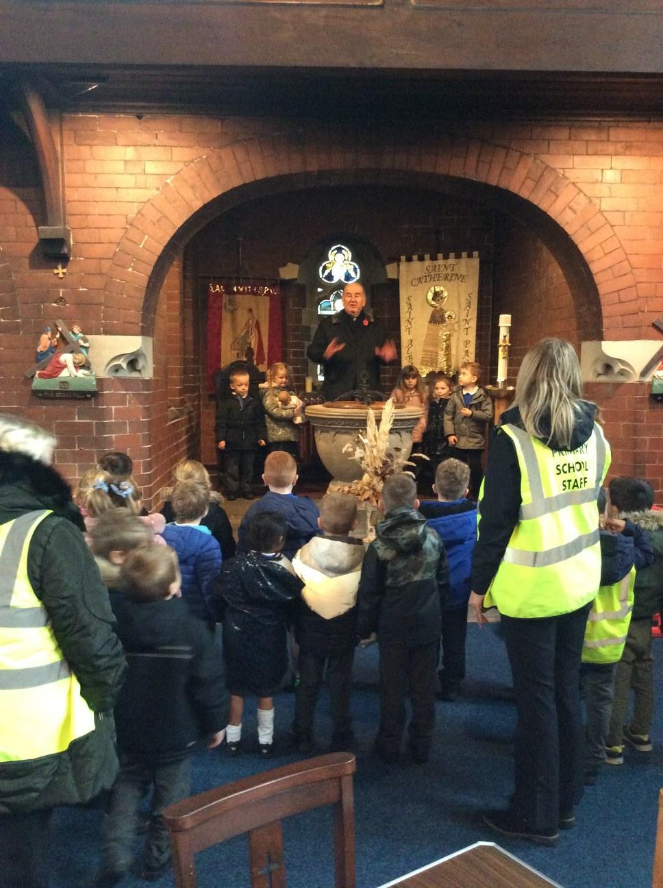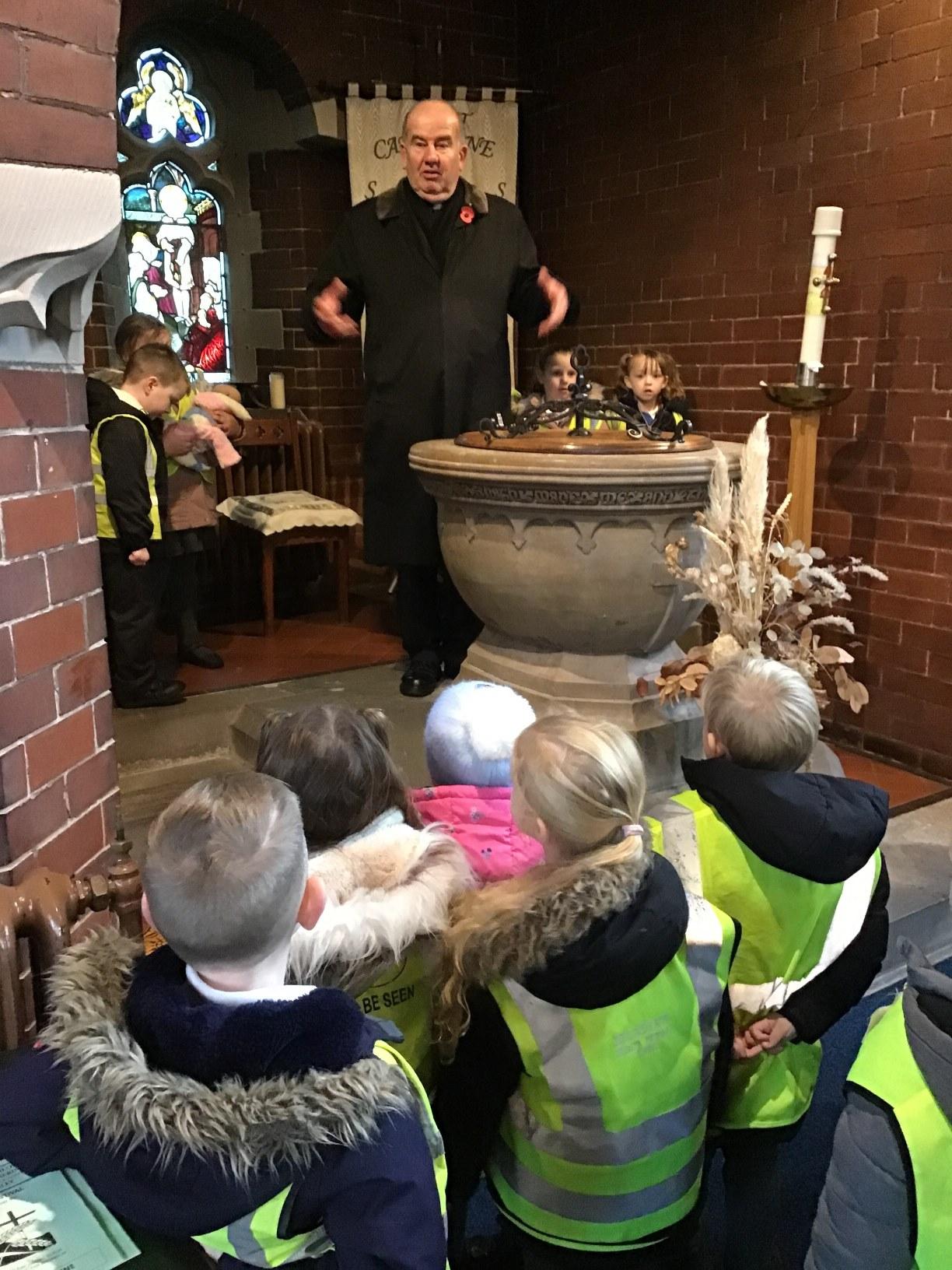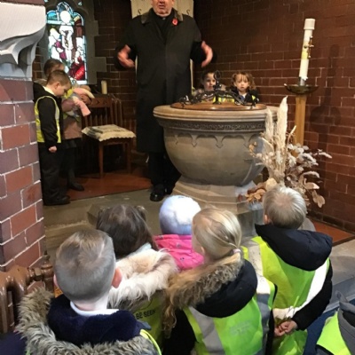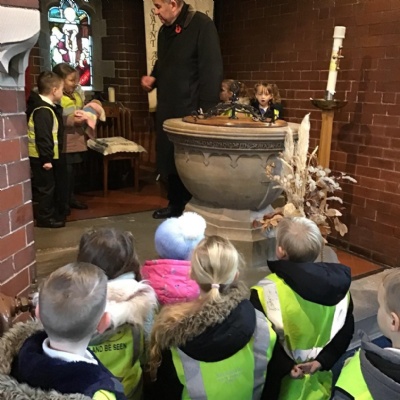 Year 1 visited St Catherine's church on Tuesday as part of their RE learning. Father Roger showed us around the church and staged a baptism using a dolly. He used holy water and the sign of the cross. After the Baptism we lit a candle. The children loved taking turns to push the pram with baby Annabelle in. The children enjoyed being in church and were very well behaved.