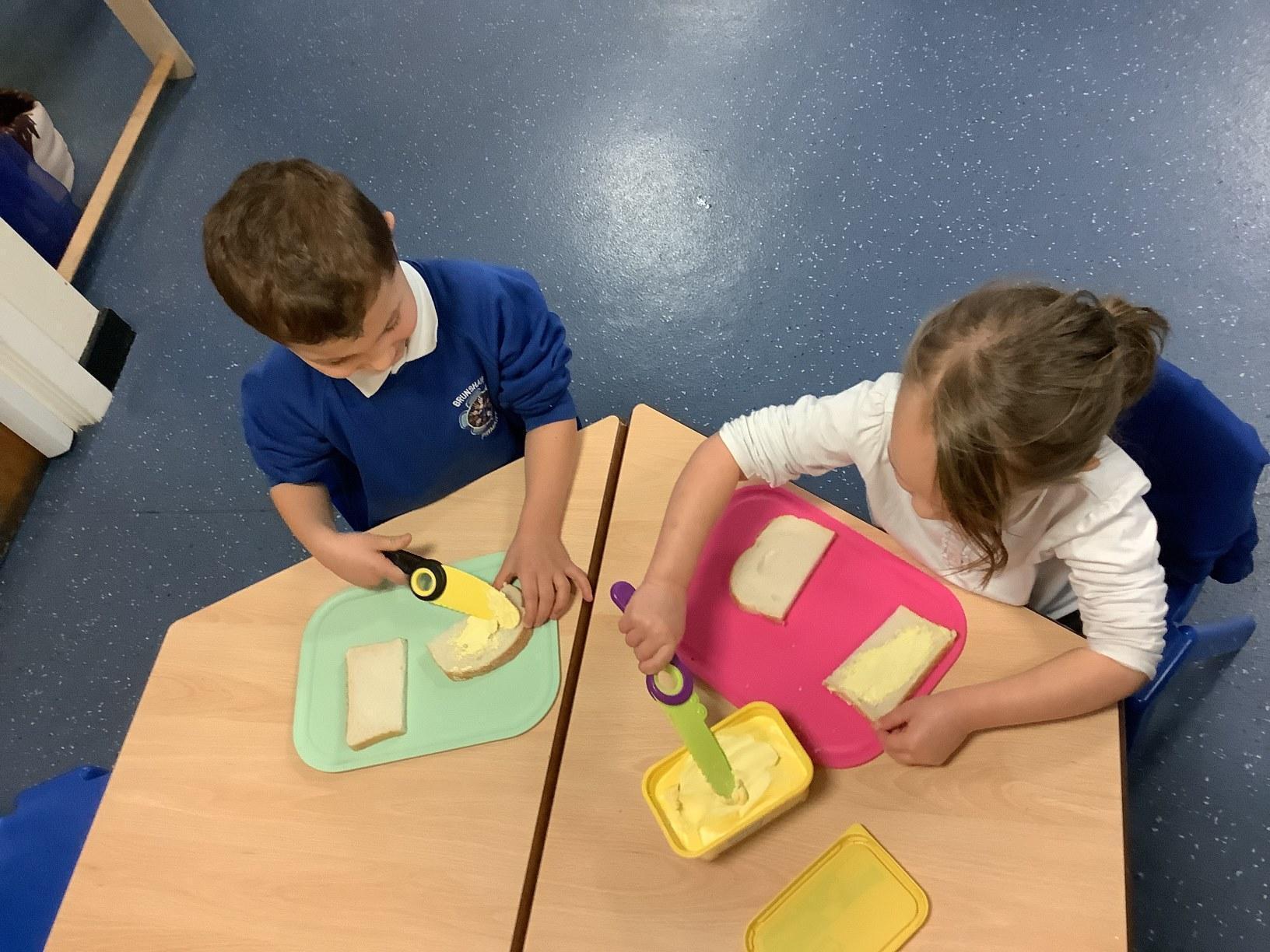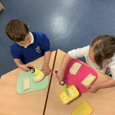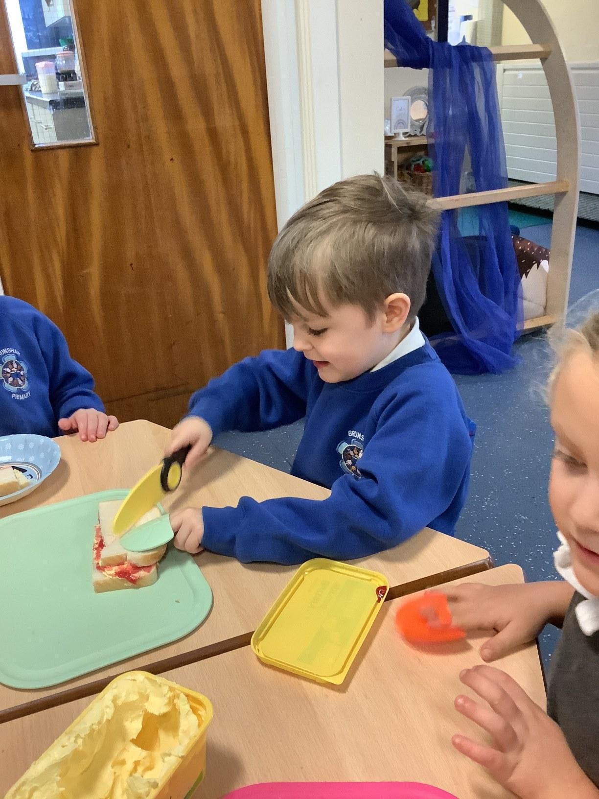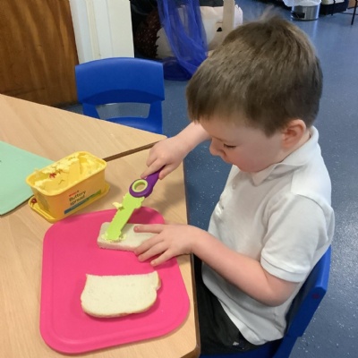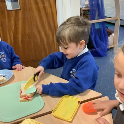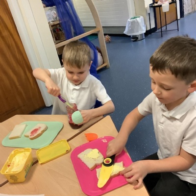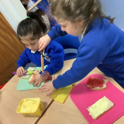 On Tuesday, we talked about carrying out activities in the correct sequence. First, we taught Buddy Bear how to brush his teeth. Then, we told Miss Lees the order of steps to make a jam sandwich. After that, we had a go at making our own. We all remembered the steps to make our sandwiches and enjoyed eating them too!