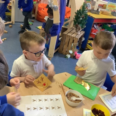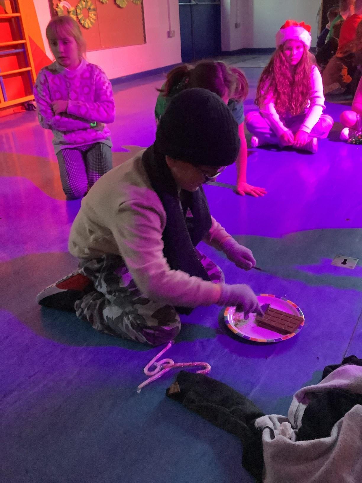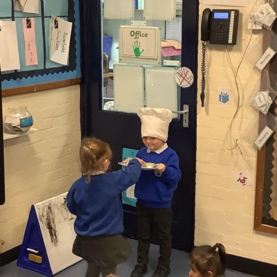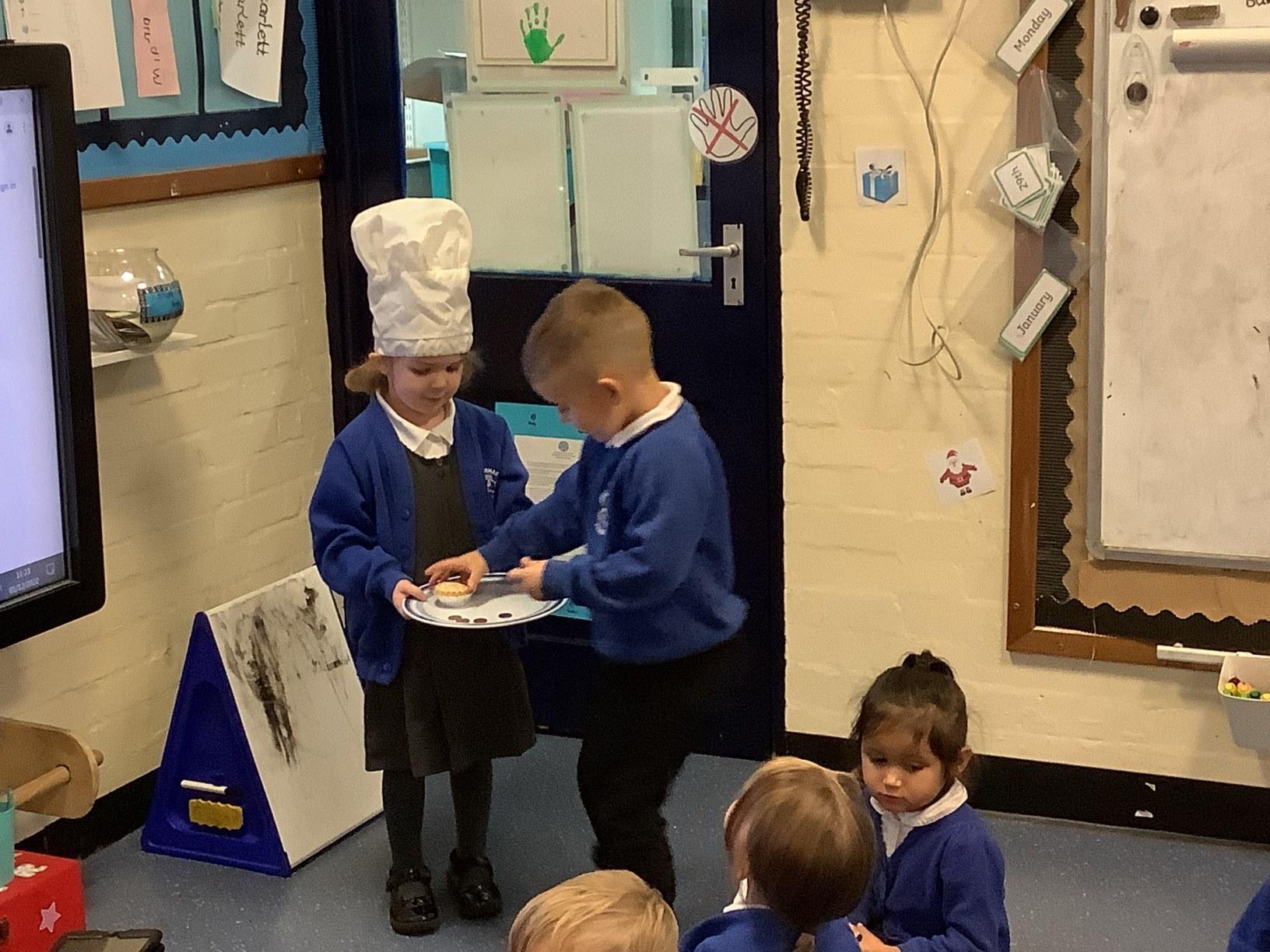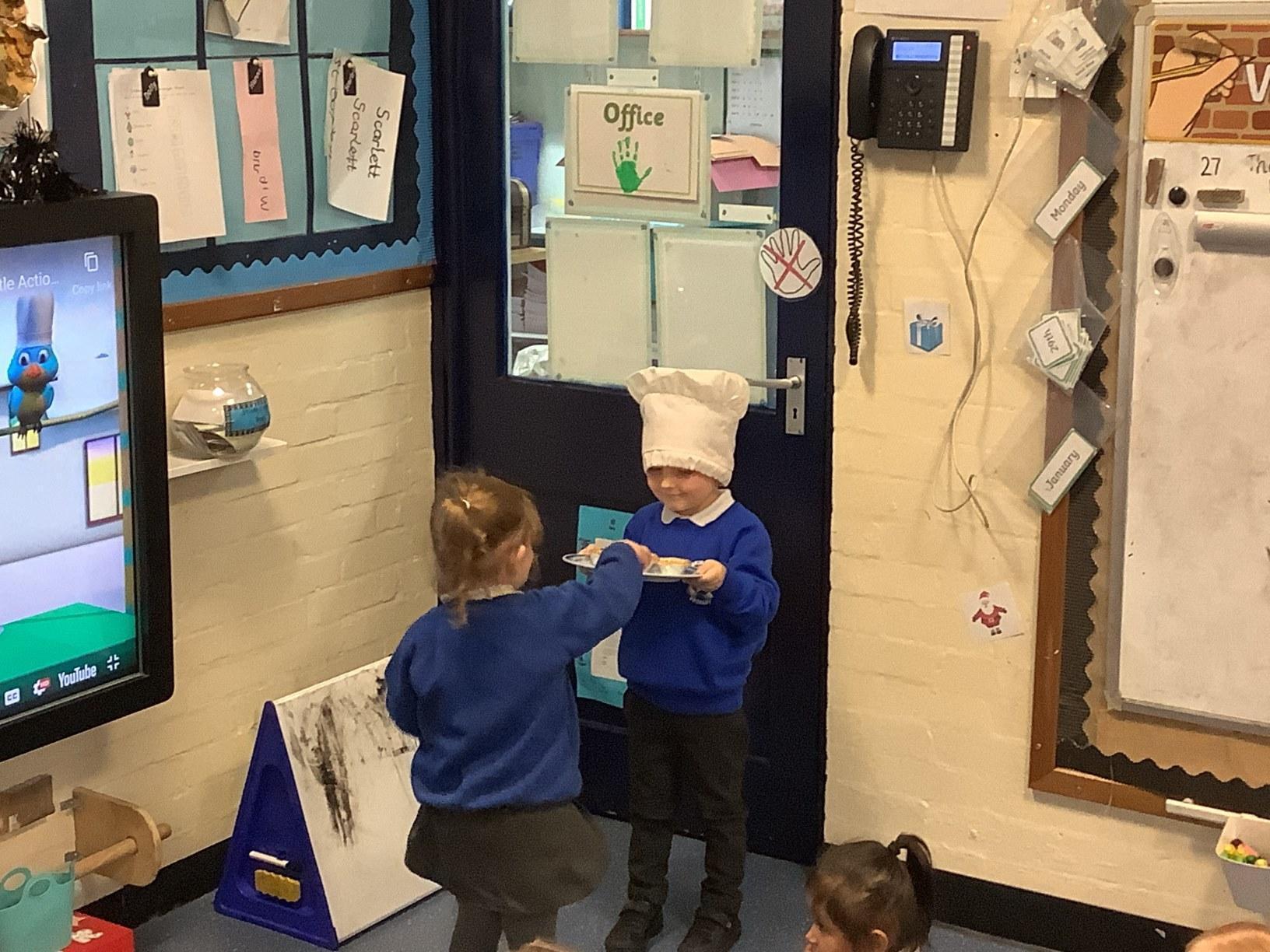 Children bought a mince pie with a penny and took one away. We used our fingers to show the answers.